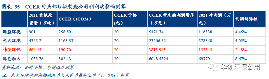 最理想情況下,CCER收入在利潤端可為垃圾焚燒頭部企業(yè)帶來3%-9%的增厚。我們選取瀚藍環(huán)境、光大環(huán)境、偉明環(huán)保和綠色動力四家頭部垃圾焚燒上市公司進行測算,在假設(shè)公司所處理的垃圾全部可以轉(zhuǎn)化為CCER的情況下,按照2021年的垃圾處理量和凈利潤,CCER收入可分別為瀚藍環(huán)境、光大環(huán)境、偉明環(huán)保、綠色動力帶來4.45%/4.02%/2.48%/8.67的利潤端彈性。