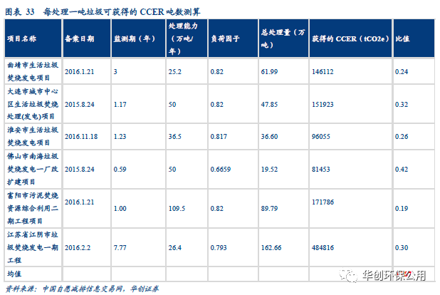 我們采用垃圾處理量與所獲得CCER噸數(shù)之比作為統(tǒng)計口徑,從簽發(fā)和備案項目中選取了較為典型的垃圾焚燒項目計算平均值,根據(jù)測算垃圾焚燒企業(yè)每處理一噸垃圾,平均獲得0.287噸CCER,在假設(shè)CCER價格為20元/噸的情況下,噸垃圾增收約為6元。