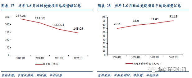 根據(jù)不完全統(tǒng)計,2022年1-6月全國垃圾焚燒發(fā)電項目開標數(shù)量為39個,投資總額約為145.09億人民幣,新增產(chǎn)能2.52萬噸/日,垃圾處理單價平均值為91.18元/噸。盡管中標項目數(shù)量較去年同期有所提升,但訂單的釋放省份多數(shù)位于中部地區(qū),日處理量超過1000噸僅6個(2021年同期為13個),故新增產(chǎn)能和投資額同比分別下滑25.66%和13.96%至2.52萬噸與145.09億元。但后補貼時代,新中標的垃圾焚燒發(fā)電項目噸垃圾處置費上浮明顯,較2021H1平均值84.04元/噸增長8.5%至91.18元。