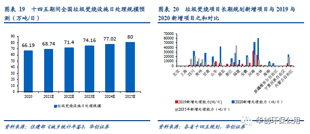 十四五政策明確2025年焚燒產(chǎn)能需達80萬噸/日(十三五為58萬噸),2020至2025年行業(yè)將保持4%的復(fù)合增速。我們對根據(jù)各省生活垃圾焚燒發(fā)電中長期專項規(guī)劃做了對比與分析后發(fā)現(xiàn),近期(2020年)規(guī)劃計劃新增項目加2019年各省新增項目合計502個,焚燒能力合計46.81萬噸/日,而遠期(2021-2030年)規(guī)劃垃圾焚燒項目合計僅276個,焚燒能力合計25.94萬噸/日。由此我們可以得出,無論是項目數(shù)量還是處理規(guī)模,未來10年的增量還沒有2019年和2020年兩年相加之和多,尤其是處理規(guī)模僅僅是近期的55%左右。半數(shù)以上的省份2019年與2020年新增項目之和大于長期規(guī)劃新增項目的總數(shù)。