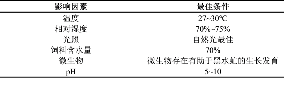 (1)溫度:黑水虻幼蟲的最適生長發(fā)育溫度是27~30℃。低于26℃成蟲不產(chǎn)卵,而溫度過高會導致幼蟲停止攝食。