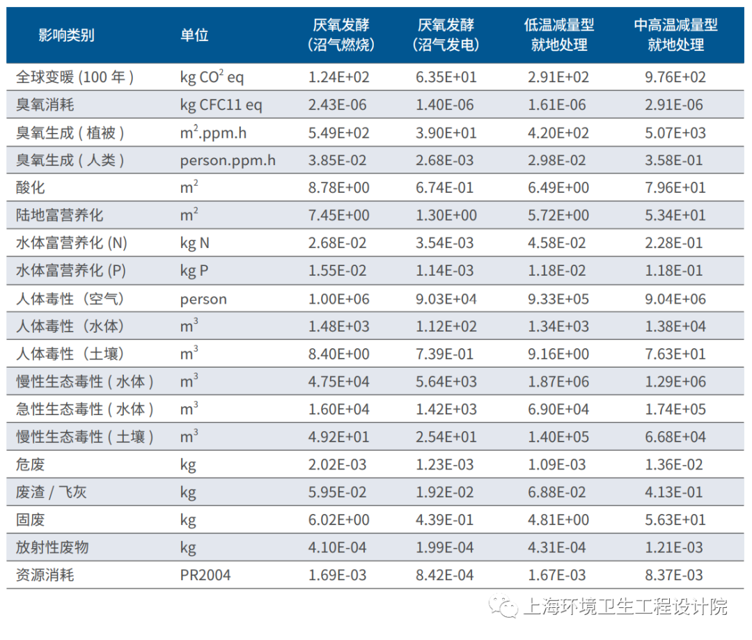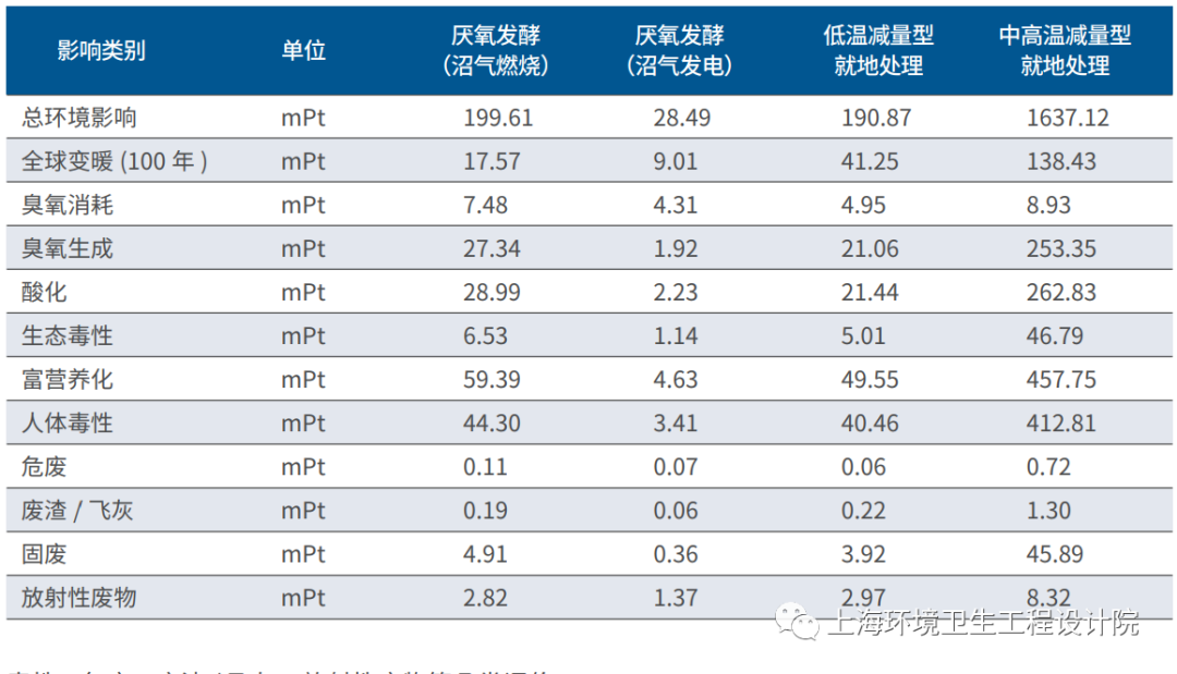 本文對(duì)厭氧發(fā)酵(沼氣燃燒)、厭氧發(fā)酵(沼氣發(fā)電)、低溫減量型就地處理、中高溫減量型就地處理四種典型工藝進(jìn)行了生命周期環(huán)境影響對(duì)比研究。通過數(shù)據(jù)收集、清單分析和結(jié)果評(píng)價(jià),得出以下結(jié)論: