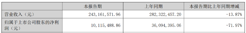 公司上半年度實現營業(yè)收入24,316.16 萬元,同比下降 13.87%;實現歸屬于上市公司股東的凈利潤 1,011.55 萬元,同比下降 71.97%。