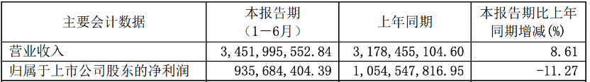 公司上半年度實現營業(yè)收入3,451,995,552.84元,同比增長8.61%;實現歸屬于上市公司股東的凈利潤935,684,404.39元,同比下降11.27%。
