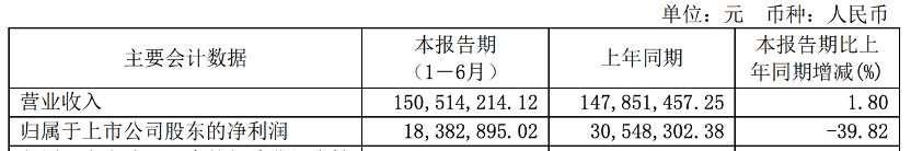 公司上半年營業(yè)收入為150,514,214.12元,同比增長 1.80%;實現歸屬于上市公司股東的凈利潤18,382,895.02元,同比下降39.82%。