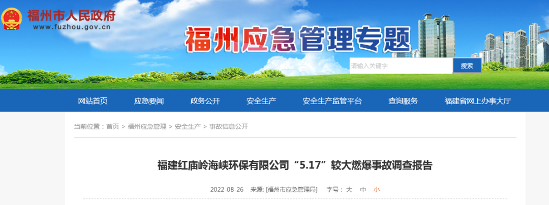 2022年5月17日上午8時(shí)54分,福建紅廟嶺海峽環(huán)保有限公司10萬方調(diào)節(jié)池上方外包作業(yè)人員違規(guī)用氬弧焊對(duì)除臭設(shè)施風(fēng)管漏點(diǎn)進(jìn)行焊接施工時(shí)發(fā)生燃爆,造成3人死亡,3人受傷,5#、6#池頂蓋坍塌,池頂除臭裝置損壞,直接經(jīng)濟(jì)損失約1800萬元。事故發(fā)生后,尹力書記、趙龍省長、郭寧寧常務(wù)副省長、林文斌副省長等領(lǐng)導(dǎo)第一時(shí)間做出重要批示,要求全力搜救失聯(lián)人員,全力搶救受傷人員;嚴(yán)格救援現(xiàn)場(chǎng)管控,防止發(fā)生次生災(zāi)害;查明原因,舉一反三,排查隱患,防范類似事故發(fā)生;做好善后工作。省委常委、市委林寶金書記、省應(yīng)急廳伍斌廳長、吳賢德市長、省建設(shè)廳王明炫副廳長等領(lǐng)導(dǎo)到場(chǎng)指導(dǎo)應(yīng)急救援。省消防救援總隊(duì)高寧宇總隊(duì)長、蘇作琴副總隊(duì)長率領(lǐng)總隊(duì)全勤指揮部到場(chǎng)指揮救援行動(dòng)。林中麟常務(wù)副市長全時(shí)指揮市應(yīng)急局、市消防救援支隊(duì)、市城管委、市衛(wèi)健委、市公安局、晉安區(qū)委區(qū)政府及多支民間救援隊(duì)進(jìn)行現(xiàn)場(chǎng)救援。根據(jù)《生產(chǎn)安全事故報(bào)告和調(diào)查處理?xiàng)l例》(國務(wù)院令第493號(hào)),經(jīng)市政府授權(quán),市應(yīng)急管理局牽頭市城管委、市公安局、市總工會(huì)、晉安區(qū)政府成立市政府福建紅廟嶺海峽環(huán)保有限公司“5.17”燃爆較大事故調(diào)查組(以下簡稱事故調(diào)查組),聘請(qǐng)3名專家參與調(diào)查,并邀請(qǐng)市紀(jì)委監(jiān)委派員參加。事故調(diào)查組按照“四不放過”和“科學(xué)嚴(yán)謹(jǐn)、依法依規(guī)、實(shí)事求是、注重實(shí)效”的原則,通過現(xiàn)場(chǎng)勘查、技術(shù)鑒定、調(diào)查取證、專家論證、人員問詢、調(diào)閱資料、問題核實(shí)和綜合分析,查明了事故發(fā)生的經(jīng)過、原因、應(yīng)急救援、人員傷亡情況和直接經(jīng)濟(jì)損失,認(rèn)定了事故性質(zhì)和責(zé)任,提出了對(duì)相關(guān)責(zé)任人員及責(zé)任單位的處理建議及防范整改措施建議。(一)福建紅廟嶺海峽環(huán)保有限公司。成立于2014年02月21日,注冊(cè)資本為500萬人民幣,法定代表人為徐國丹,經(jīng)營狀態(tài)為存續(xù),工商注冊(cè)號(hào)為350100100368616,注冊(cè)地址為福州市晉安區(qū)鼓山鎮(zhèn)洋里路16號(hào)綜合樓一樓107室,經(jīng)營范圍包括城市污水處理及其再生利用;垃圾滲瀝液收集及處理、環(huán)境污染治理設(shè)施的投資、建設(shè)、運(yùn)營;城市餐廚垃圾處理;環(huán)境污染治理設(shè)施運(yùn)營咨詢服務(wù)及技術(shù)服務(wù)(依法須經(jīng)批準(zhǔn)的項(xiàng)目,經(jīng)相關(guān)部門批準(zhǔn)后方可開展經(jīng)營活動(dòng))。為福建海峽環(huán)保集團(tuán)股份有限公司獨(dú)立法人的全資子公司,10萬方新調(diào)節(jié)池項(xiàng)目的實(shí)際管理單位。(二)福建致辰宇洋環(huán)??萍加邢薰尽3闪⒂?015年3月12日,注冊(cè)資本為1000萬人民幣,法定代表人為俞果,經(jīng)營狀態(tài)為存續(xù),工商注冊(cè)號(hào)為350100100432860,注冊(cè)地址為福州市晉安區(qū)新店鎮(zhèn)秀山路245號(hào)索高廣場(chǎng)4#樓1層101單元,經(jīng)營范圍包括一般項(xiàng)目:大氣污染治理;水污染治理;生態(tài)環(huán)境監(jiān)測(cè)及檢測(cè)儀器儀表銷售;大氣污染監(jiān)測(cè)及檢測(cè)儀器儀表銷售;海洋水質(zhì)與生態(tài)環(huán)境監(jiān)測(cè)儀器設(shè)備銷售;環(huán)境保護(hù)監(jiān)測(cè);水質(zhì)污染物監(jiān)測(cè)及檢測(cè)儀器儀表銷售等(除依法須經(jīng)批準(zhǔn)的項(xiàng)目外,憑營業(yè)執(zhí)照依法自主開展經(jīng)營活動(dòng))。受福建紅廟嶺海峽環(huán)保有限公司委托對(duì)10萬方新調(diào)節(jié)池進(jìn)行除臭設(shè)施提升。(三)福建省偉邦市政環(huán)保工程設(shè)計(jì)研究院有限公司,成立于2006-04-26,注冊(cè)資本為300萬人民幣,法定代表人為劉建偉,經(jīng)營狀態(tài)為開業(yè),工商注冊(cè)號(hào)為350100100173044,注冊(cè)地址為福州市鼓樓區(qū)工業(yè)路611號(hào)福建高新技術(shù)創(chuàng)業(yè)園主樓4層北6房,經(jīng)營范圍包括市政、環(huán)保工程技術(shù)咨詢、設(shè)計(jì),市政、環(huán)保設(shè)備儀器儀表研發(fā)、推廣、銷售,環(huán)保生物廢水處理劑的研發(fā)、推廣、銷售,市政環(huán)保工程承包建設(shè)。(依法須經(jīng)批準(zhǔn)的項(xiàng)目,經(jīng)相關(guān)部門批準(zhǔn)后方可開展經(jīng)營活動(dòng))。該公司投資入股福建致辰宇洋環(huán)??萍加邢薰境袛埖?0萬方新調(diào)節(jié)池的除臭設(shè)施提升項(xiàng)目;受福建致辰宇洋環(huán)??萍加邢薰镜姆ㄈ舜碛峁?,該公司工程師陳連文負(fù)責(zé)10萬方新調(diào)節(jié)池的除臭設(shè)施提升項(xiàng)目具體管理。(四)福州嘉鑫華強(qiáng)金屬制品有限公司。成立于2018-06-15,注冊(cè)資本為200萬人民幣,法定代表人為羅維嘉,經(jīng)營狀態(tài)為存續(xù),工商注冊(cè)號(hào)為350121100236032,注冊(cè)地址為福建省福州市閩侯縣祥謙鎮(zhèn)林森大道28號(hào),經(jīng)營范圍包括金屬制品、工藝品、建筑
