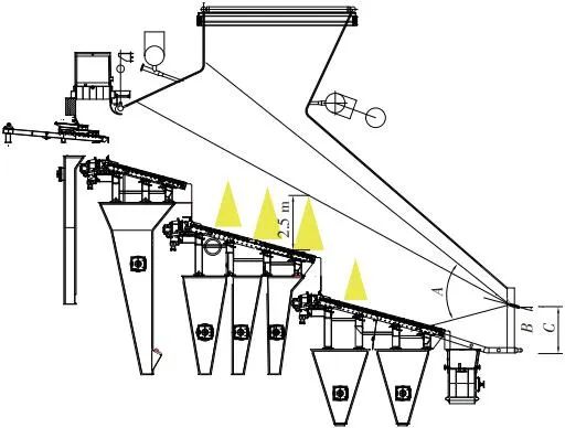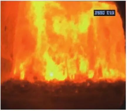 當前生活垃圾焚燒爐廣泛采用的爐膛火焰監(jiān)視系統(tǒng)基本上都是由早期應用在水泥廠、鋼鐵廠的加熱爐、退火爐和氧化鋁廠等行業(yè)內(nèi)的高溫看火工業(yè)電視演變升級而來。內(nèi)窺式數(shù)字高清爐膛火焰監(jiān)視系統(tǒng)成像裝置主要由耐高溫針孔電動鏡頭、寶石物鏡、光學濾光片、光圈焦距調(diào)節(jié)器等組成,配有電控推進器、氣源控制柜、光端機等輔助設(shè)備。其核心問題是如何在生活垃圾焚燒爐的高溫、多塵、強腐蝕環(huán)境中長周期穩(wěn)定運行,保證火焰畫面不丟包、不失真。1)優(yōu)勢特性分析。一是技術(shù)成熟、運行穩(wěn)定。隨著我國近一二十年間生活垃圾發(fā)電廠的興建,爐膛火焰監(jiān)視系統(tǒng)的技術(shù)也處于不停地優(yōu)化和迭代之中,目前已能滿足穩(wěn)定、可靠的要求。其中常規(guī)配置參數(shù)為攝像頭300 萬像素,響應時間2 s,光圈(F數(shù))1.6,焦距2.4 mm。二是工作環(huán)境好。爐膛火焰監(jiān)視器探頭通常安裝于焚燒爐后墻,所處位置是垃圾燃燒最末端,常規(guī)工況下探頭周圍煙氣溫度通常<600 ℃。較之焚燒爐其他高溫環(huán)境已算“宜居地帶”。三是維護量小。焚燒爐后墻幾乎沒有結(jié)焦現(xiàn)象,常規(guī)爐膛火焰監(jiān)視探頭開孔位置僅存有因爐膛偶爾正壓時煙氣外冒造成的積灰,積灰量不大,清理工作較為輕松。2)劣勢特性分析。一是參數(shù)單一。因垃圾焚燒行業(yè)爐型構(gòu)造和燃燒成分的特殊性,垃圾焚燒爐長期采用的火焰探頭利用的是光學成像原理,運行人員僅能通過觀察火焰形狀和位置來判斷焚燒爐工況,無法得到多維度參數(shù)。二是視角局限。爐膛火焰探頭通常位于焚燒爐后墻,安裝角度朝向爐內(nèi)成斜向上方向,與水平線夾角15°左右,探頭視場角通常>60°。以某大型列動順推爐排焚燒爐為例,在此仰視角度下可以看到爐排燃燒段尾部、燃燼段前部兩面明顯的火焰幕墻,由于火焰鋒面遮擋,很難觀察到燃燒段中前部的火焰狀況。 以某單臺750 t/d大型列動順推爐排焚燒爐中爐膛火焰監(jiān)視器安裝位置和顯示畫面為實例,具體分析火焰成像狀態(tài)。其實際火焰成像畫面見圖1。成像角度是由焚燒爐后墻探頭位置向上仰視爐膛。因焚燒工況十分良好,靠近后墻的燃燼段區(qū)域幾乎沒有明火,燃燒段尾部成一面豎直、光亮的黃紅色火焰鋒面,高度約為2.5 m。對應的爐膛火焰監(jiān)視器安裝示意如圖2所示。爐膛火焰探頭安裝在焚燒爐后墻,安裝位置與后墻觀火平臺地面距離為C(m)。開孔傾角與水平方向夾角為B(°),有效視場角為A(°)。圖2中由黃色填充的三角形區(qū)域代表正常燃燒火焰,其中標注高度2.5 m的區(qū)域為燃燒爐排尾部火焰,即為圖1所顯示的火焰鋒面。顯然,從爐膛火焰監(jiān)視器向上望去,燃燒段前部、中部火焰為視野盲區(qū)。由于被燃燒段尾部火焰鋒面遮擋,通過火焰監(jiān)視器通常只能看到燃燒段尾部、燃燼段前部這兩個區(qū)域的火焰。