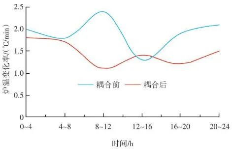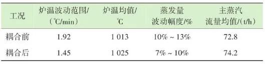根據(jù)工藝設(shè)計和焚燒爐結(jié)構(gòu),從燃燒段至燃燼段前部為垃圾的燃燒區(qū)域,爐排底部依次有4行風室,即圖7中所示2、3、4和5行風室,每行各有3列,共計12個風室。按照前述的項目實例,圖6中的12個紅外溫度測點,可以得到依次對應12個風室上部的火焰圖像和燃燒溫度。在傳統(tǒng)ACC系統(tǒng)中,一次風的理論供風量主要依據(jù)垃圾熱值、垃圾占比、蒸發(fā)量設(shè)定值、鍋爐熱效率等參數(shù)計算得到,在得到理論計算值后,會根據(jù)鍋爐負荷、垃圾料層厚度、垃圾濕度、燃燒和燃燼段上部溫度等參數(shù)的波動對理論計算值進行修正。其中溫度參數(shù)是由安裝在焚燒爐墻兩側(cè)的熱電偶反饋而來,爐溫熱電偶的長度一般為1.0~1.3 m,除去爐墻壁厚,熱電偶露出爐內(nèi)的長度一般在250 mm左右,熱電偶材質(zhì)為鎳鉻-鎳硅,熱電偶前端耐磨頭長度為250~300 mm,耐磨頭材質(zhì)為鈷60。由于能夠反饋的溫度只能是熱電偶周圍溫度,因此會造成3點限制:①測點數(shù)量有限,若熱電偶數(shù)量增加,鍋爐開孔數(shù)量也要隨之上升,通常燃燒和燃燼區(qū)域安裝熱電偶數(shù)量為4~6支;②耦合性較高,抗干擾能力較低,其中的溫度修正系數(shù)雖然權(quán)重占比不大,但由于熱電偶數(shù)量有限,其單一溫度值對整體其他區(qū)域有連鎖影響,因此局部溫度與局部風量無法一一獨立對應;③準確性存在衰減,熱電偶的原理是溫度信號轉(zhuǎn)換成熱電動勢信號,通過二次儀表呈現(xiàn)被測介質(zhì)溫度。而隨著磨損、腐蝕的加重,其準確性也逐漸衰減。其中鎳硅合金中的硅和鎳的優(yōu)先氧化是引起鎳鉻-鎳硅熱電偶熱電動勢超差、準確性降低的主要原因。根據(jù)上述內(nèi)容,我們在得到理論計算風量之后,針對每一段風室進行獨立的風量修正。圖9中:M為對應區(qū)域內(nèi)溫度設(shè)定值(℃);H為垃圾層厚度偏差百分比(%);P為對應區(qū)域內(nèi)溫度實時反饋值(℃);K為對應區(qū)域內(nèi)溫度變化率(℃/min);√ ̄為速度變化率高低限范圍(℃/min);LCUT為低切保護模塊(℃);LAG為高階濾波模塊(℃);A為理論計算風量(m3/h);B為實際輸出計算風量(m3/h)。如圖9所示,X區(qū)域?qū)崟r反饋溫度經(jīng)過低切保護模塊LCUT和濾波模塊LAG后,與預設(shè)值M進行比較,計算的差值進入溫度-風量折算函數(shù)F(x)。同時根據(jù)溫度上升和下降的速度變化率K,對函數(shù)的輸出速率進行擾動,改變其響應速度。首先X區(qū)域的理論計算風量是耦合前原有ACC系統(tǒng)通過垃圾熱值、垃圾占比、鍋爐蒸發(fā)量、氧氣含量、鍋爐焓值等一系列參數(shù)計算出來的爐排下一次風支管風量,是實時變化的動態(tài)數(shù)值,而X區(qū)域的溫度預設(shè)值M與反饋值P的差值反映的是X區(qū)域內(nèi)垃圾焚燒過于劇烈,還是處于未完全燃燒狀態(tài)。因為垃圾焚燒過程的復雜性,可以做出以下關(guān)系函數(shù):一方面在爐內(nèi)垃圾層厚度等于或大于理論的標準厚度前提下,當X區(qū)域溫度M大于P則風量減少,當X區(qū)域溫度M小于P則風量增加,當X區(qū)域溫度M等于P則保持原有ACC計算風量不變,此時選擇公式F1(x)內(nèi)部函數(shù);另一方面在爐內(nèi)垃圾層厚度小于標準厚度前提下,此時判斷料層過薄,風量太大容易出現(xiàn)燒空、燒斷料的情況,因此當M與P的差值為正數(shù)或負數(shù)時都會適當減少風量,但根據(jù)溫度的高或低對應減少風量的幅度會不同,此時利用F2(x)內(nèi)部函數(shù)。12個溫度劃分區(qū)域都基于此耦合邏輯,具體設(shè)定參數(shù)適時調(diào)整。通過干擾獨立配風的風量,達到改變整個焚燒爐一次風風量的效果。生活垃圾焚燒爐的排放物在滿足GB 18485—2014 生活垃圾焚燒污染控制標準的前提下,為保障焚燒爐的長期安全運行、汽機系統(tǒng)的穩(wěn)定高效運轉(zhuǎn),通常通過爐溫和主蒸汽流量這兩個因素來判斷鍋爐運行是否良好。以下工況為某項目單臺750 t/d生活垃圾焚燒爐在紅外熱成像管理系統(tǒng)應用前、應用后兩段時期的實際運行參數(shù),以此實例來解析該系統(tǒng)的運行效果。該項目額定主蒸汽流量為74 t/h。如圖10所示,藍色實線為耦合前24 h變化率波動范圍,紅色實線為耦合后24 h變化率波動范圍。爐溫變化率指的是焚燒爐上、中、下3層共計9個溫度測點的熱電偶反饋溫度在每分鐘內(nèi)升高或降低的溫度值,而溫度變化率波動范圍指的是單位時間內(nèi)溫度變化率最高值與最低值之間的溫度差,該差值越大表明爐溫波動越大,即工況越不穩(wěn)定,波動范圍越小表明工況越平穩(wěn)。此期間溫度也一直未低于環(huán)保部要求的最低限(850 ℃/2 s),均介于950~1 050 ℃。焚燒爐主蒸汽流量曲線如圖11所示,左側(cè)縱坐標為主蒸汽流量,額定蒸發(fā)量74 t/h。圖中藍色實線為紅外熱成像系統(tǒng)與ACC系統(tǒng)耦合前24 h的主蒸汽流量曲線,紅色虛線為紅外熱成像系統(tǒng)與ACC系統(tǒng)耦合后24 h的主蒸汽流量曲線。表1中參數(shù)可以計算出耦合前后焚燒爐爐溫波動范圍相對縮減了24.5%,焚燒爐爐溫均值提高了1.2%,蒸發(fā)量波動幅度縮減了3個百分點,主蒸汽流量提高了1.4 t/h。經(jīng)過對主要運行參數(shù)的定量分析,可以看出結(jié)合了紅外熱成像系統(tǒng)的ACC系統(tǒng)在功能性和穩(wěn)定性上有顯著提升。基于目前紅外熱成像管理系統(tǒ