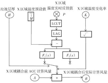 ACC系統(tǒng)是以理論計算設(shè)計為基礎(chǔ),以鍋爐主蒸汽流量為核心控制目標,以垃圾料層厚度、一次風系統(tǒng)母管壓力、爐排下各風室一次風流量、燃燒和燃燼爐排上部溫度(熱灼減率)、氧氣濃度等參數(shù)為次要控制目標,以垃圾熱值和占比動態(tài)測量為給料量核算依據(jù),通過改變給料量和供風量的手段,來實現(xiàn)運行人員的極少干預。其中供風量的調(diào)整,主要閉環(huán)調(diào)節(jié)是以主蒸汽量的變化為最高權(quán)重。而溫度控制(燃燒和燃燼段上部熱電偶溫度變化值)作為輔助的閉環(huán)調(diào)節(jié)之一,權(quán)重占比較輕,約占5%~10%。
