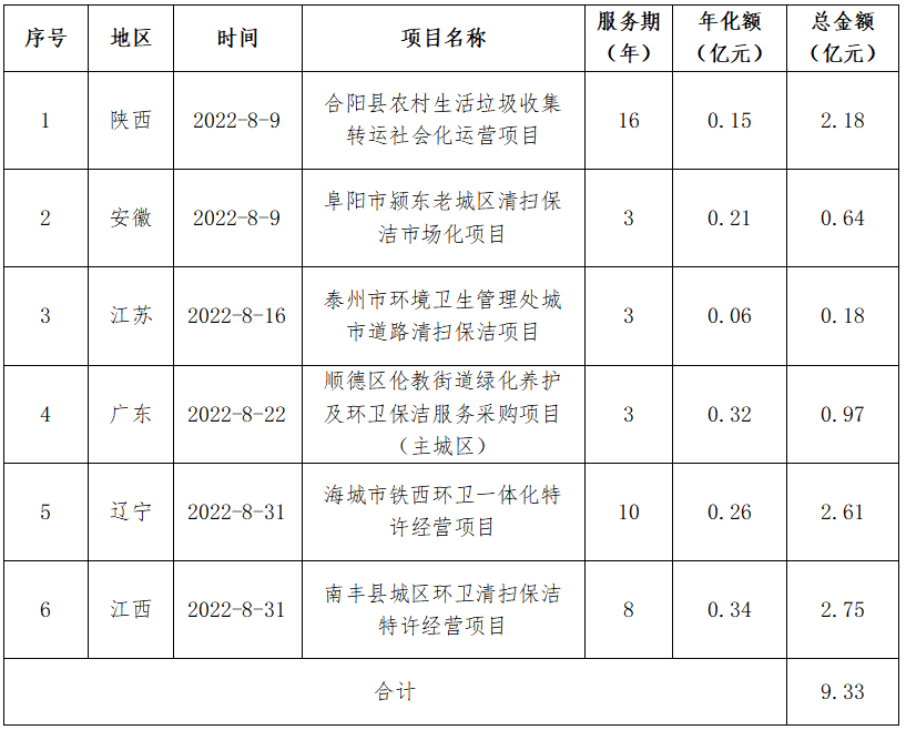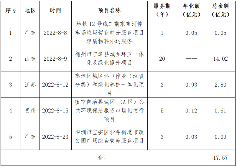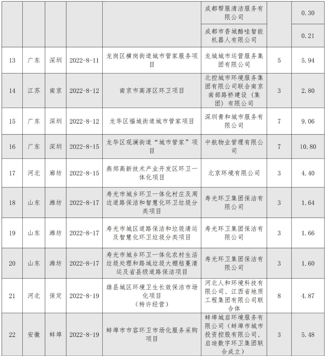 8月,河北昌潤(rùn)達(dá)環(huán)境工程有限公司憑借19.36億元的定州市城區(qū)環(huán)境衛(wèi)生市場(chǎng)化服務(wù)項(xiàng)目登頂企業(yè)月度排行榜榜首。定州市城區(qū)環(huán)境衛(wèi)生市場(chǎng)化服務(wù)項(xiàng)目特許經(jīng)營(yíng)期12年。服務(wù)范圍為河北省定州市市區(qū)西城、北城、南城、長(zhǎng)安辦、經(jīng)濟(jì)開(kāi)發(fā)區(qū)及高速高鐵站主次干道、小街巷、商業(yè)街區(qū)、便民市場(chǎng)和市區(qū)水域,清掃保潔總面積9617672.66平方米,項(xiàng)目負(fù)責(zé)公共區(qū)域生活垃圾(不含物業(yè)小區(qū)其他垃圾)產(chǎn)生量每天200~260噸。昌潤(rùn)達(dá)以1.61億元/年的投標(biāo)報(bào)價(jià)位中標(biāo)該項(xiàng)目。昌潤(rùn)達(dá)成立于2014年8月,位于保定市國(guó)家大學(xué)科技園8號(hào)樓,是河北省首批成立的一家集垃圾分類、城鄉(xiāng)環(huán)衛(wèi)一體化、公用設(shè)施管理維護(hù)、農(nóng)村廁改與吸污處理、智慧環(huán)衛(wèi)等多位一體的科技型環(huán)衛(wèi)一體化大型集團(tuán),系中國(guó)清潔服務(wù)行業(yè)百?gòu)?qiáng)企業(yè)。昌潤(rùn)達(dá)是一家典型的立足本土的環(huán)衛(wèi)企業(yè),其服務(wù)區(qū)域主要集中在保定市及周邊縣、區(qū)和邯鄲市部分縣鄉(xiāng)村。2021年8月,知名物企佳兆業(yè)美好曾宣布擬以3.67億元的價(jià)格收購(gòu)昌潤(rùn)達(dá)70%的股權(quán),但最終因“公司經(jīng)營(yíng)策略調(diào)整”,交易在年底告吹。從今年中標(biāo)的項(xiàng)目來(lái)看,昌潤(rùn)達(dá)似乎還沒(méi)有準(zhǔn)備走出河北,依舊在深耕自己的“一畝三分地”。● 北控城市環(huán)境連下五城,全年項(xiàng)目金額超48億元8月,北控城市環(huán)境迎來(lái)一波拿標(biāo)高潮,連續(xù)中標(biāo)5個(gè)環(huán)衛(wèi)項(xiàng)目,合計(jì)中標(biāo)金額達(dá)17.57億元,一舉拿下榜眼位置。表2 北控城市環(huán)境8月中標(biāo)項(xiàng)目匯總
