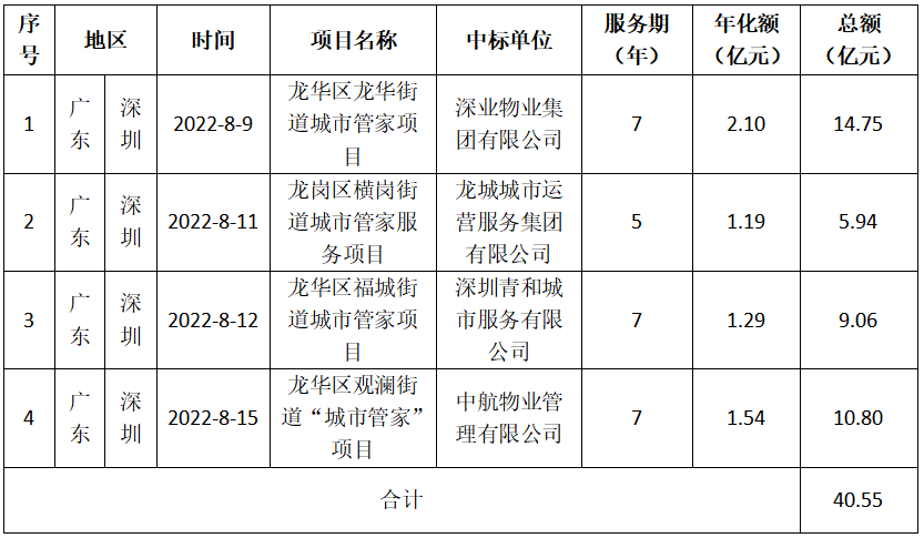 表5 深圳8月開(kāi)標(biāo)“城市管家”項(xiàng)目匯總