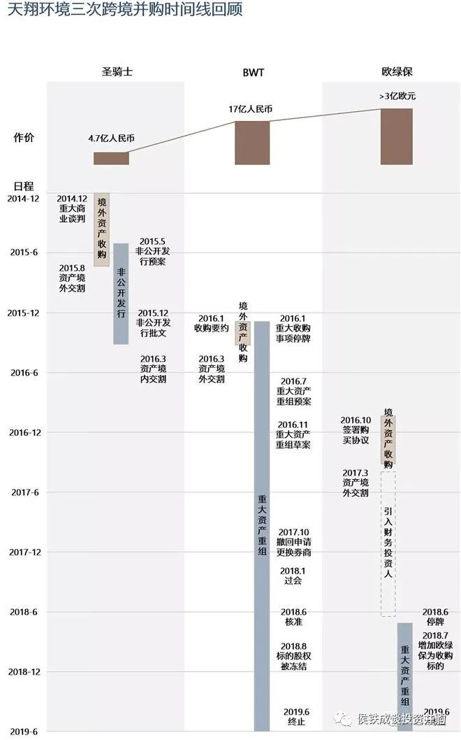 原本的十大并購案例,寫著寫著寫成了十大環(huán)保并購慘案。為了緩解大家失落悵惘的心情,免費奉上一個跌到谷底的案子,大家再忍一忍,黎明前的黑暗。本文為環(huán)保十大并購案例之五,天翔環(huán)境海外收購圣騎士、BWT、歐綠保,最終公司破產(chǎn)退市。我們之前看的幾個并購失敗案例,雖然也都是十年苦心經(jīng)營,毀于一旦,但大部分只是元氣大傷,主營業(yè)務利潤虧光,大股東黯然離場而已。今天的案例,并購的后果是上市公司破產(chǎn)退市,大股東債務纏身被檢查機關起訴,員工債權人均蒙受巨大損失。里里外外大幾十億的虧損,堪稱“環(huán)保上市公司十年內(nèi)最大的慘案”。歡迎大家多提寶貴意見。尋找底層規(guī)律,帶動行業(yè)發(fā)展,避免低級錯誤重現(xiàn)。幾經(jīng)掙扎的天翔環(huán)境最終還是在2021年8月30日迎來了被深交所摘牌的結局。天翔環(huán)境原名天保重裝,原主業(yè)為大型節(jié)能環(huán)保及清潔能源設備,具體包括分離機械系列設備和水輪發(fā)電機組設備,并于2014年完成上市。當時,天翔環(huán)境的主營已露疲態(tài),上市當年收入下滑超過30%,公司開始尋找轉(zhuǎn)型方向。2015年開始,天翔環(huán)境通過連續(xù)的大手筆并購進軍環(huán)保領域,先后以4.7億收購美國的污泥處理設備公司圣騎士、17億收購德國的水處理公司BWT,并在隨后迎來了自己的高光時刻,2016年底,其市值來到了107.5億的歷史最高值。好景不長,因為體外并購未能裝入上市公司,導致了一系列問題,悲劇大幕就此拉開。2018年,天翔環(huán)境在年報中披露,控股股東直接控制的成都親華科技有限公司非經(jīng)營性資金占用24.55億,而當時天翔環(huán)境本身的債務逾期金額已達到17.58億。從此,天翔環(huán)境股價持續(xù)下跌,直至2021年8月30日最終被深交所摘牌。回顧天翔環(huán)境的發(fā)展歷程,核心是三次海外收購,分別是2014年12月收購的美國圣騎士,2016年1月收購的BWT公司,2016年10月收購的歐綠保,交易金額預期超過3億歐元。其中第一個交易順利完成,后面兩個交易只完成了體外收購,并沒有完成裝入上市公司的動作,最終也導致了上市公司與大股東的相繼崩盤。第一筆收購,公司與券商聯(lián)合成立基金,收購標的公司。然后上市公司非定向增發(fā),募集資金收購基金持股。收購與定增并行推進,加快交易節(jié)奏,順利地完成了交易。這個案子金額相對小,方案謹慎,交易結構簡單,資本市場當時資金充足,因此完成相對容易些。企業(yè)由此嘗到了甜頭,默認為其他項目也可以先收購,再定增裝入上市公司。2016年2月,僅僅在上市公司剛剛完成非公開發(fā)行一個月、圣騎士股權尚未完成交割之時,天翔環(huán)境又再次啟動了對更大的收購標的——估值達到2.2億歐元的德國水處理公司BWT。因為交易時間緊張,天翔和基金先籌集資金收購,然后再由大股東組建資金替代基金,大股東向其他人承諾兜底,最終由上市公司定增完成收購。在當時的背景下,是有很多基金愿意參與并購定增,同時也默認定增即可賺錢的邏輯,愿意參與這種有一定風險的投資。基金的收益在于定增后的股價增值,以及定增不成的大股東保底,風險在于定增后股價下跌,定增失敗后大股東無法保底。當時環(huán)境下,基金方總體上還是認為風險收益匹配的。這種情況跟當時的熱錢有關,即大部分資金來自信托,錢多無處可投。當時的資金投資邏輯并不穩(wěn)定,是一種特殊情況。但第二筆收購出現(xiàn)了問題,監(jiān)管機構審核達2年之久。兩個原因,一個是券商的原因,一個是資金的來源問題。最終獲得批文的時間已經(jīng)是2018年6月。雪上加霜的是,公司在這筆交易尚未完成之際,大股東又組團以3億歐元的價格收購了更大的一家歐洲垃圾處理公司,同樣無法完成交易。這個時候大股東和上市公司都扛不住了,體外并購的杠桿利息,疊加當時嚴厲“去杠桿”的外部環(huán)境以及上市公司的PPP業(yè)務占用大量資金無法回收,跌跌不休的股價最終帶崩了大股東以及上市公司的債務崩盤。2018年8月,大股東企業(yè)親華科技持有中德天翔20.59%的股份被債權人凍結,導致上市公司收購中德天翔的交易無法完成交割。2019年1月24日上市公司公告收到證監(jiān)會立案調(diào)查通知書,此時天翔環(huán)境大股東因債務危機侵占上市公司資金已經(jīng)公開。2019年6月19日,天翔環(huán)境公告終止收購中德天翔以及歐綠保的交易,大股東的過橋基金退出失敗,天翔環(huán)境開始自由解體。公司2021年年報披露,在2020年8月收到鄧親華及一致行動人鄧翔提供的成都市公安局出具 的《取保候?qū)彌Q定書》,2021年1月19日,公司、鄧親華、鄧翔被移送成都市人民檢察院審查起訴。整個故事中,公眾號“文藝馥欣”做了精彩的分析和點評,上述配圖和部分敘述來源于其公眾號文章,文末有相關鏈接。本案整個過程也比較清晰,公司上市后謀求發(fā)展轉(zhuǎn)型,先定增10億人民幣,發(fā)行收購了美國圣騎士公司,然后打算采用收購美國圣騎士公司的操作,體外收購德國的BWT公司,然后裝入上市公司。一筆17億的收購,并不是17億的虧損,為何會導致上市公司兩年累計虧損36億,大股東占用24億資金,依舊未能改變結果,反倒一起陷入泥潭,釀成驚天慘案呢?