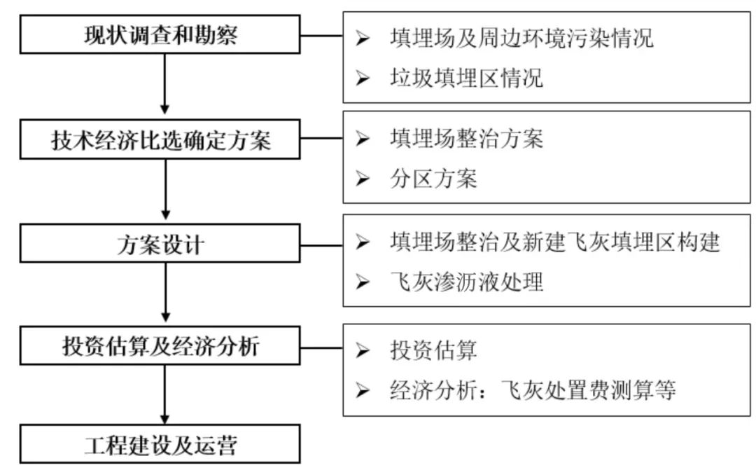 根據(jù)住房城鄉(xiāng)建設(shè)部發(fā)布的《2022年中國(guó)城市建設(shè)狀況公報(bào)》,截至2022年底,全國(guó)城市生活垃圾焚燒處理能力已達(dá) 80.46萬(wàn)噸/日,占比為72.53%。我國(guó)生活垃圾焚燒爐型主要為機(jī)械爐排爐和循環(huán)流化床,其中機(jī)械爐排爐飛灰產(chǎn)率一般為2%~5%,循環(huán)流化床飛灰產(chǎn)率一般為8%~15%。飛灰產(chǎn)率按3%~5%計(jì)算,則年產(chǎn)飛灰量約為881萬(wàn)~1468萬(wàn)噸。由于含有較高浸出濃度的重金屬和高毒性當(dāng)量的二噁英等有毒有害物質(zhì),生活垃圾焚燒飛灰被列入《國(guó)家危險(xiǎn)廢物名錄》。根據(jù)《2022年生態(tài)環(huán)境公報(bào)》,2022年工業(yè)危險(xiǎn)廢物產(chǎn)生量為9514.8萬(wàn)噸,飛灰占比約為9.2%~15.4%,飛灰產(chǎn)量較大。飛灰的妥善處置關(guān)系到生活垃圾焚燒廠(chǎng)的穩(wěn)定運(yùn)行,也是生活垃圾焚燒行業(yè)的難題和短板。目前,飛灰處置方式包括進(jìn)入危險(xiǎn)廢物填埋場(chǎng)填埋處置、固化/穩(wěn)定化處理后進(jìn)入生活垃圾填埋場(chǎng)填埋處置、水洗預(yù)處理后水泥窯協(xié)同處置、高溫熔融/玻璃化、高溫?zé)Y(jié)等,其中,固化/穩(wěn)定化處理后進(jìn)入生活垃圾填埋場(chǎng)填埋處置由于技術(shù)成熟且成本較低,是當(dāng)前飛灰處置的主流技術(shù)。填埋場(chǎng)分區(qū)改造建設(shè)必要性對(duì)于新建填埋場(chǎng)選址困難或飛灰產(chǎn)量較小的地區(qū),對(duì)現(xiàn)有生活垃圾填埋場(chǎng)進(jìn)行分區(qū)改造以滿(mǎn)足固化/穩(wěn)定化飛灰填埋要求是較為經(jīng)濟(jì)可行的方式。隨著生活垃圾焚燒發(fā)電廠(chǎng)的建成,現(xiàn)有生活垃圾填埋場(chǎng)將停止接收生活垃圾,若現(xiàn)有生活垃圾填埋場(chǎng)尚有可利用的剩余庫(kù)容,對(duì)其進(jìn)行分區(qū)改造,既可以充分發(fā)揮其稀缺資源作用,又可以解決生活垃圾焚燒廠(chǎng)的飛灰處置和大修期內(nèi)生活垃圾應(yīng)急處置問(wèn)題,同時(shí)還可以完善生活垃圾填埋場(chǎng)的現(xiàn)有設(shè)施并治理現(xiàn)存污染,可謂一舉多得。因此,分區(qū)改造項(xiàng)目的建設(shè)十分必要且具有意義。總的來(lái)說(shuō),項(xiàng)目的建設(shè)具有較好的經(jīng)濟(jì)、環(huán)保和社會(huì)效益,具體體現(xiàn)在:經(jīng)濟(jì)效益:固化/穩(wěn)定化飛灰填埋收益可部分覆蓋現(xiàn)有生活垃圾填埋場(chǎng)治理投資;環(huán)保效益:現(xiàn)有生活垃圾填埋場(chǎng)污染問(wèn)題得到改善、飛灰得到妥善處置;社會(huì)效益:填埋場(chǎng)原址改造,避免了新選址帶來(lái)的占用土地資源、搬遷、新的環(huán)境影響源等問(wèn)題。如前所述,生活垃圾填埋場(chǎng)分區(qū)改造具有填埋場(chǎng)治理及飛灰入場(chǎng)填埋的雙重屬性,因此,其建設(shè)流程可以參考生活垃圾衛(wèi)生填埋場(chǎng)封場(chǎng)治理、擴(kuò)建,并結(jié)合項(xiàng)目的實(shí)際情況及當(dāng)?shù)叵嚓P(guān)主管部門(mén)的要求進(jìn)行,從建設(shè)方案角度,推薦建設(shè)流程如下圖所示: