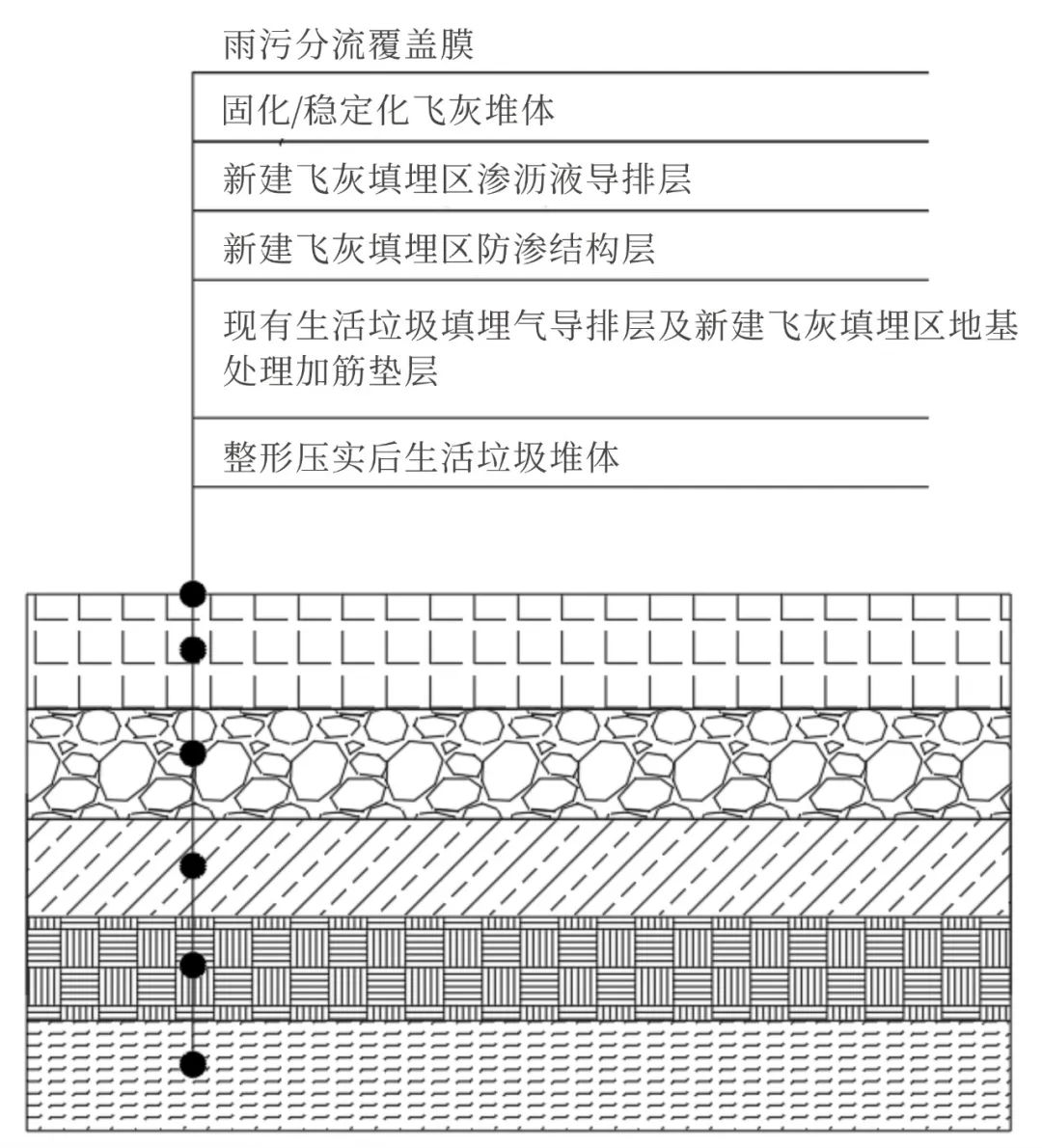 ▲圖2 生活垃圾填埋場(chǎng)改造前現(xiàn)場(chǎng)情況根據(jù)《生活垃圾填埋場(chǎng)污染控制標(biāo)準(zhǔn)》(GB 16889-2008)等相關(guān)標(biāo)準(zhǔn)要求,經(jīng)處理合格滿(mǎn)足入場(chǎng)條件的生活垃圾焚燒飛灰在生活垃圾填埋場(chǎng)中應(yīng)單獨(dú)分區(qū)填埋。固化/穩(wěn)定化飛灰當(dāng)長(zhǎng)期在生活垃圾產(chǎn)生的酸性滲瀝液浸泡下具有滲出有害物質(zhì)的潛在風(fēng)險(xiǎn),故要求分區(qū)填埋。通過(guò)方案比選,異地處置和水平分區(qū)由于需要大規(guī)模的開(kāi)挖、臭氣等環(huán)境影響更大、工程建設(shè)周期長(zhǎng)、投資較高等較難實(shí)施,故本項(xiàng)目確定采用原位治理的垂直分區(qū)方案。固化/穩(wěn)定化飛灰與生活垃圾性質(zhì)完全不同,其密度大于生活垃圾,此外,生活垃圾堆體通常會(huì)隨著時(shí)間的推移發(fā)生沉降,并繼續(xù)產(chǎn)生填埋氣和滲瀝液,因此,如何確保固化/穩(wěn)定化飛灰入場(chǎng)填埋后填埋場(chǎng)的穩(wěn)定安全,是本項(xiàng)目擬解決的關(guān)鍵問(wèn)題。