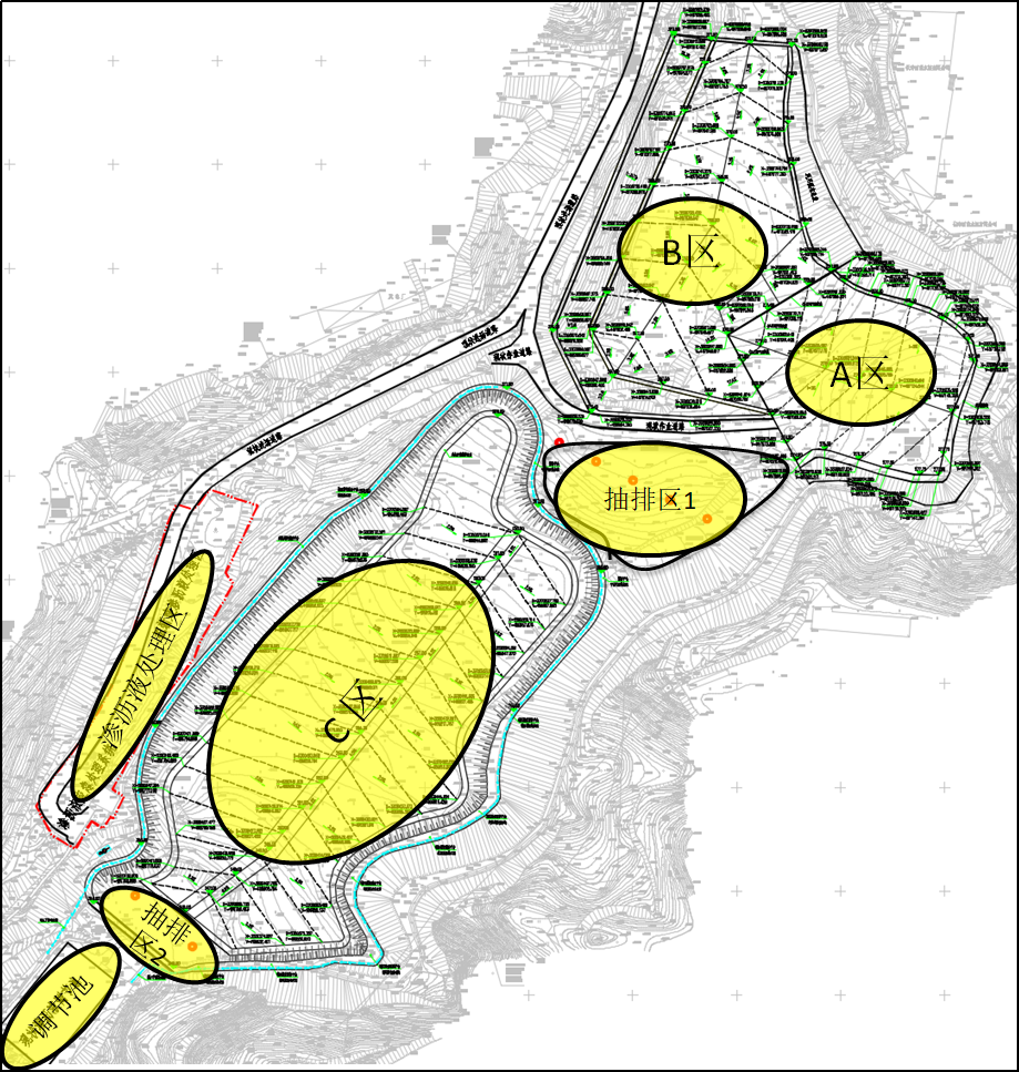 根據(jù)項(xiàng)目的實(shí)際情況,本項(xiàng)目采用分區(qū)建設(shè)、分區(qū)運(yùn)行的方案,分區(qū)方案詳見(jiàn)圖4。本項(xiàng)目由庫(kù)區(qū)中部的進(jìn)場(chǎng)道路分隔成兩個(gè)大的區(qū)域,遠(yuǎn)離調(diào)節(jié)池的為上游填埋區(qū)、靠近調(diào)節(jié)池的為下游填埋區(qū),其中,上游填埋區(qū)根據(jù)生活垃圾填埋情況、垃圾堆體液位及承載力情況,分為A、B區(qū)。本項(xiàng)目首先實(shí)施條件最好的A區(qū),再依次實(shí)施B、C區(qū)。在庫(kù)區(qū)中部和壩前設(shè)置了兩個(gè)抽排區(qū),通過(guò)新增降水井對(duì)生活垃圾滲瀝液進(jìn)行抽排,以控制和觀(guān)測(cè)垃圾堆體液位,保障填埋場(chǎng)的安全運(yùn)行。
