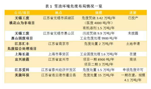 2016年11月,雪浪環(huán)境牽頭發(fā)起設(shè)立江蘇無錫雪浪金茂環(huán)保產(chǎn)業(yè)投資企業(yè)(有限合伙),基金總投資為5億元,雪浪環(huán)境通過設(shè)置企業(yè)并購(gòu)基金“無錫雪浪金茂”進(jìn)一步布局危廢市場(chǎng)。2017年7月,無錫雪浪金茂通過股權(quán)轉(zhuǎn)讓的形式收購(gòu)江蘇愛科65%的股權(quán)。2017年8月,無錫雪浪金茂通過股權(quán)轉(zhuǎn)讓的形式收購(gòu)美旗環(huán)保20%的股權(quán)。美旗環(huán)保擬投資建設(shè)灌云工業(yè)廢物綜合處理中心項(xiàng)目以處理灌云縣臨港產(chǎn)業(yè)區(qū)內(nèi)危廢為主,兼顧灌云、灌南、徐圩新區(qū)、響水等地危險(xiǎn)廢物綜合處理,總設(shè)計(jì)處理規(guī)模15萬(wàn)噸/年,其中工程一期處理規(guī)模4.1萬(wàn)噸/年。