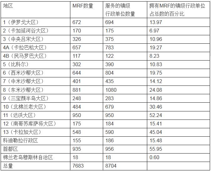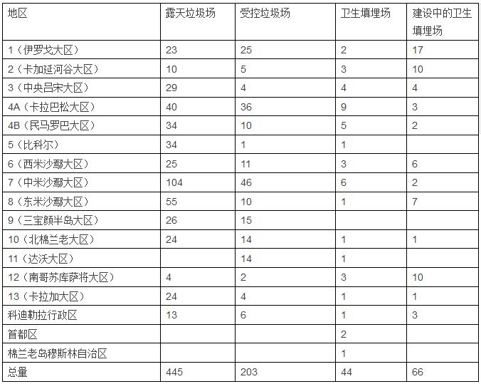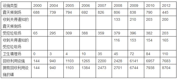 2012年時(shí),菲律賓全國(guó)有7683個(gè)回收利用設(shè)施,滿(mǎn)足了8704個(gè)鎮(zhèn)的需求。下表列出了菲律賓全國(guó)回收利用設(shè)施的狀況。