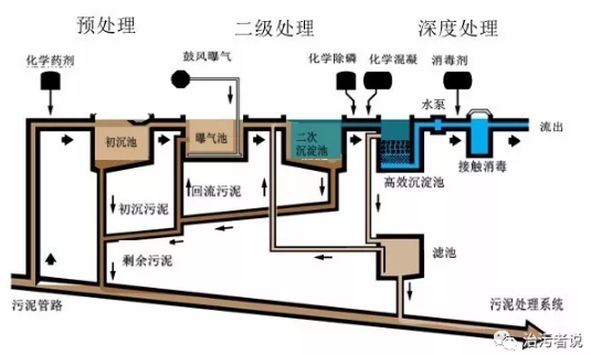 一個采用活性污泥法的污水處理廠,一般有三個處理區(qū)域,為預處理段,二級處理段,深度處理段,在每個階段,都會產生不同的污泥,在上圖中我們可以看到,預處理段的初沉池會產生初沉污泥,在曝氣池和二沉池組成的生物處理系統(tǒng),會產生活性污泥的剩余污泥,在深度處理段,會產生化學藥劑產生的化學污泥,這些污泥通過地下管路的匯集,最終進入到污泥處置單元,進行污泥的處理。
