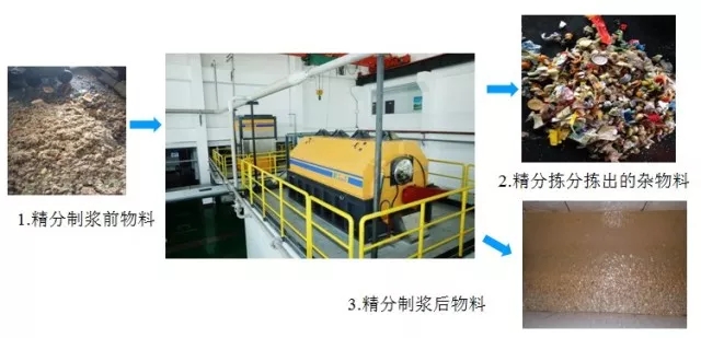 精分制漿機(jī)對物料進(jìn)行二次雜物分揀及破碎制漿,將物料中粒徑大小在20mm以上的雜物分離出系統(tǒng),如垃圾中的塑料、竹木、陶瓷、玻璃瓶、瓶蓋、筷子、骨頭以及貝殼等海鮮類硬物質(zhì)雜物,雜物外運(yùn)處理。同時對大塊有機(jī)質(zhì)進(jìn)行破碎得到以有機(jī)質(zhì)8mm以下粒度的漿狀物料為主的均質(zhì)物料。