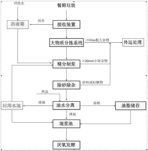 慈溪餐廚垃圾預(yù)處理工藝采用機(jī)械精細(xì)化分揀制漿工藝,即“物料接收+大物質(zhì)分揀+精分制漿+除砂除雜+油水分離”工藝,通過大物質(zhì)分揀+精分制漿+除砂除雜逐級減量化設(shè)計,可有效去除物料中的雜物,保證了最大化地將一些對后道工序設(shè)備損壞最大的硬性物質(zhì)如:瓷盤、玻璃瓶、金屬物質(zhì)、貝殼、骨頭等和纖維類輕性物質(zhì)如:塑料、餐巾以及砂粒和輕飄物如塑料、辣椒籽、木質(zhì)纖維等有效地分離出來,得到的液相做油脂分離,避免這些物質(zhì)對輸送泵組、離心提油設(shè)備的磨損和堵塞。