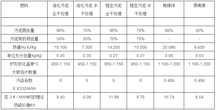 當(dāng)消化污泥的有機物含量 OTR = 50% 和干化后污泥固含量為90% DS時,污泥熱值大約是Hu = 10,100 kJ/kg 或 2.81 kWh/kg。在以下表 1內(nèi),舉例列出了各種不同類型的消化污泥和好氧穩(wěn)定化污泥性能參數(shù),并和褐煤進行比較。根據(jù)污泥熱值,還計算了干化污泥的熱能商業(yè)價值。