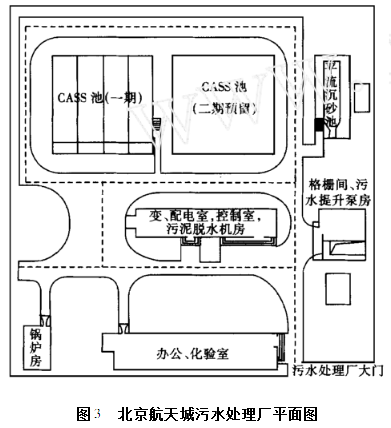 污水處理廠分二期建設(shè),總用地0172hm2,設(shè)計(jì)時(shí)考慮遠(yuǎn)、近期結(jié)合,占地面積盡可能小。其平面規(guī)劃按規(guī)范進(jìn)行,綠化率為47%,環(huán)形道路,污水與污泥處理兼顧,常規(guī)分析化驗(yàn)儀器完備(見圖3)。