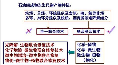 石油是烷烴、芳烴、環(huán)烷烴及含氮、硫、氧等非烴類組分的混合物,其中多環(huán)、雜環(huán)芳烴以及膠質(zhì)、瀝青質(zhì)等組分生物降解性較差。石油及次生代謝產(chǎn)的組成特征決定了修復(fù)的難度和復(fù)雜性。因此, 單一聯(lián)合技術(shù)不能很好的解決污染問(wèn)題時(shí),需要考慮聯(lián)合使用各種處理技術(shù)。