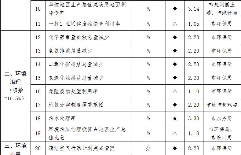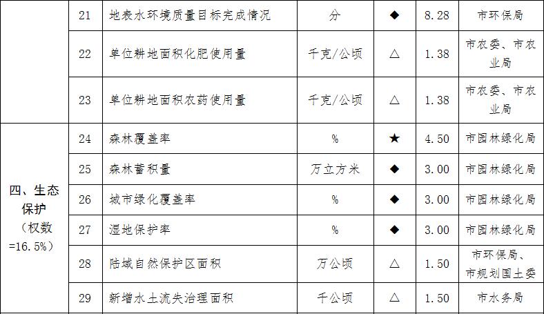 2.“資源利用”“生態(tài)環(huán)境保護(hù)”類各子目標(biāo)采用專項(xiàng)考核部門組織開展專項(xiàng)考核認(rèn)定的數(shù)據(jù)??己酥笜?biāo)未覆蓋的區(qū),對(duì)應(yīng)的指標(biāo)分值分?jǐn)傊猎搮^(qū)同類別其他指標(biāo),保持“資源利用”“生態(tài)環(huán)境保護(hù)”一級(jí)指標(biāo)總分不變。