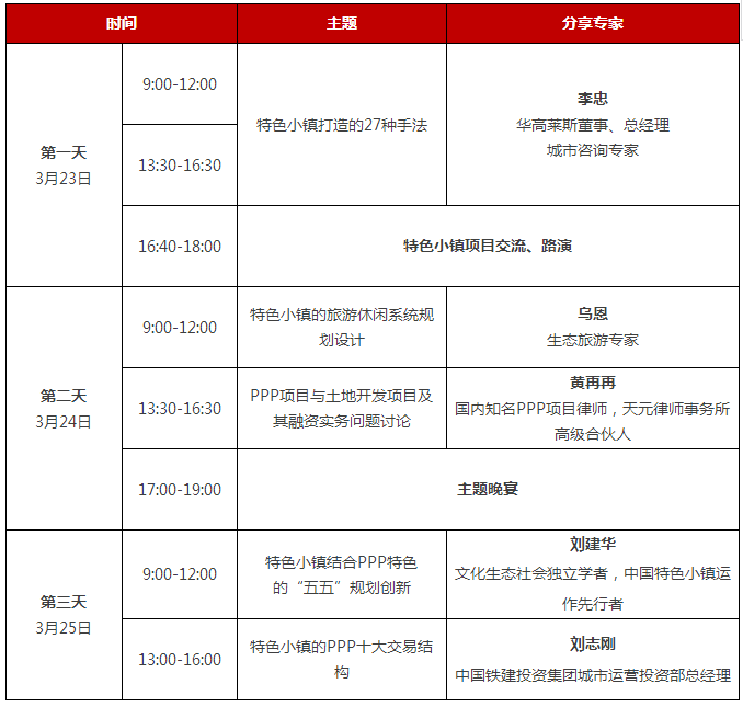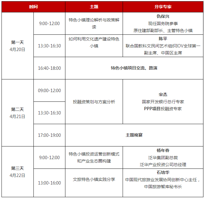 政策解讀、文旅特色小鎮(zhèn)實踐分享、投融資策劃與方案分析、特色小鎮(zhèn)投資運營創(chuàng)新模式和產(chǎn)業(yè)生態(tài)圈構建、如何利用文化遺產(chǎn)建設特色小鎮(zhèn)