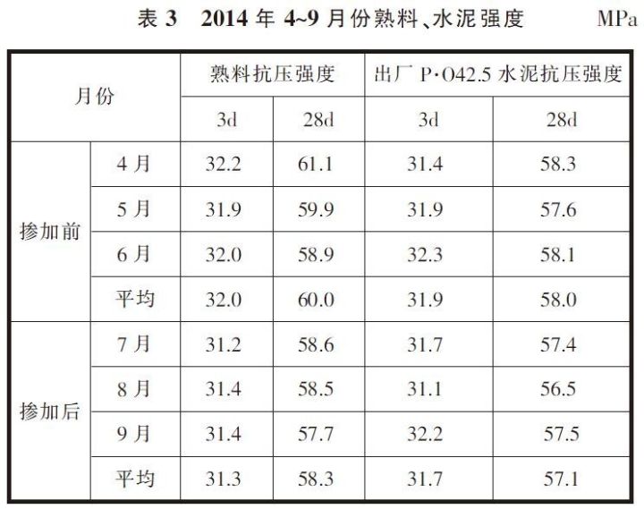 在生料中摻加污染土壤,造成生料易燒性的變化和有害成分的增加,對(duì)窯系統(tǒng)帶來一系列的不利影響,進(jìn)而導(dǎo)致熟料強(qiáng)度尤其是28d強(qiáng)度出現(xiàn)明顯下滑,同時(shí)對(duì)水泥強(qiáng)度尤其是28d抗壓強(qiáng)度造成一定影響,具體數(shù)據(jù)見表3。