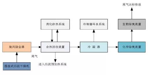熱量回收系統(tǒng)時本次設計的重點,熱干化系統(tǒng)尾氣處理工藝流程圖如下。