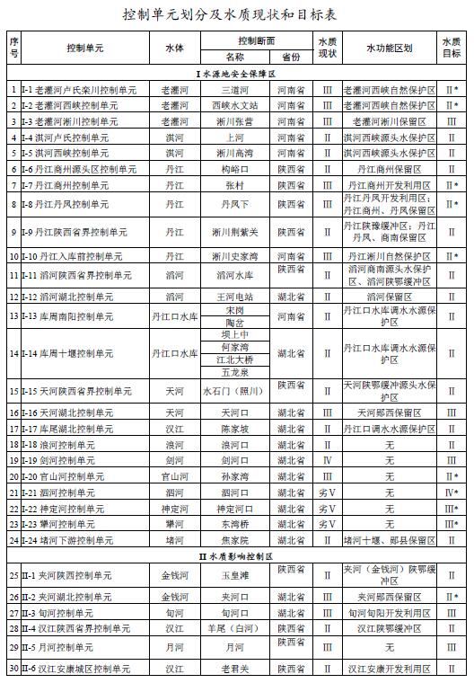 丹江口水庫和中線取水口水質(zhì)穩(wěn)定并保持Ⅱ類,庫區(qū)總氮濃度不劣于現(xiàn)狀水平;到2020年,漢江和丹江干流斷面水質(zhì)為Ⅱ類,其它直接匯入丹江口水庫的主要河流水質(zhì)達到水功能區(qū)水質(zhì)目標。