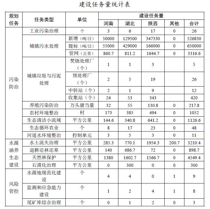圍繞規(guī)劃目標,規(guī)劃實施污染防治、水源涵養(yǎng)與生態(tài)建設(shè)、風險管控3大類建設(shè)任務(wù),估算總投資196億元。其中:工業(yè)污染防治項目26項,估算投資6.00億元;城鎮(zhèn)污水處理新增污水處理能力526830噸/日,新增管網(wǎng)3317公里,提標改造能力650000噸/日,估算投資43.17億元;垃圾和污泥采取收集、預(yù)處理、轉(zhuǎn)運、焚燒進行綜合處理,新增垃圾和污泥處理處置能力8000噸/日,估算投資35.62億元;養(yǎng)殖污染防治新增217.8萬頭豬當量治理能力,估算投資10.94億元;農(nóng)村環(huán)境綜合整治新增建制村1052個,估算投資15.76億元;生態(tài)清潔小流域治理面積1126.6平方公里,估算投資11.27億元;生態(tài)循環(huán)農(nóng)業(yè)與面源污染綜合治理試點48個,估算投資14.50億元;河道綜合整治(含人工濕地)11個控制單元,估算投資5.25億元;綜合治理水土流失面積3210平方公里,估算投資25.68億元;退耕還林還草和石漠化治理、天然林保護工程,估算投資16.4億元;水源地規(guī)范化建設(shè)項目9個,估算投資5.93億元;監(jiān)測和應(yīng)急能力建設(shè)項目8個,估算投資1.14億元;尾礦庫綜合治理3個,估算投資4.35億元。