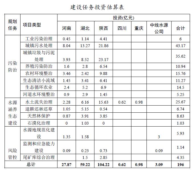按任務(wù)類型分,水污染防治類投資142.51億元,水源涵養(yǎng)生態(tài)建設(shè)類投資42.07億元,風險管控類投資11.42億元。