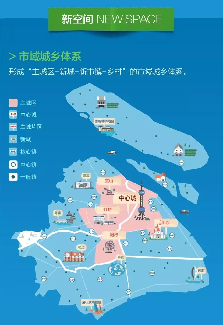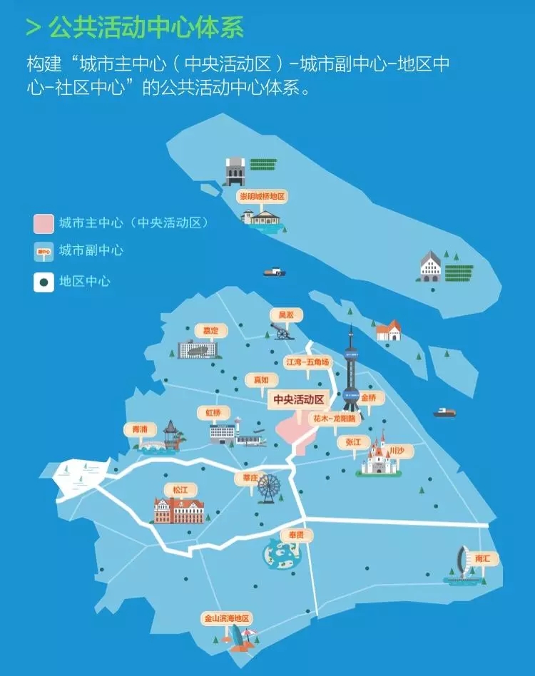 中央活動區(qū)包括小陸家嘴、外灘、人民廣場、徐家匯等十幾個區(qū)域,重點發(fā)展金融服務、總部經(jīng)濟、商務辦公、文化娛樂、創(chuàng)新創(chuàng)意、旅游觀光等全球城市核心功能。城市副中心包括五角場等9個主城副中心、5個新城中心和金山濱海地區(qū)、崇明城橋地區(qū)2個核心鎮(zhèn)中心等,發(fā)展面向長三角和市域的綜合服務中心,兼顧全球城市部分核心功能。地區(qū)中心和社區(qū)中心主要承擔所在區(qū)域的公共服務。