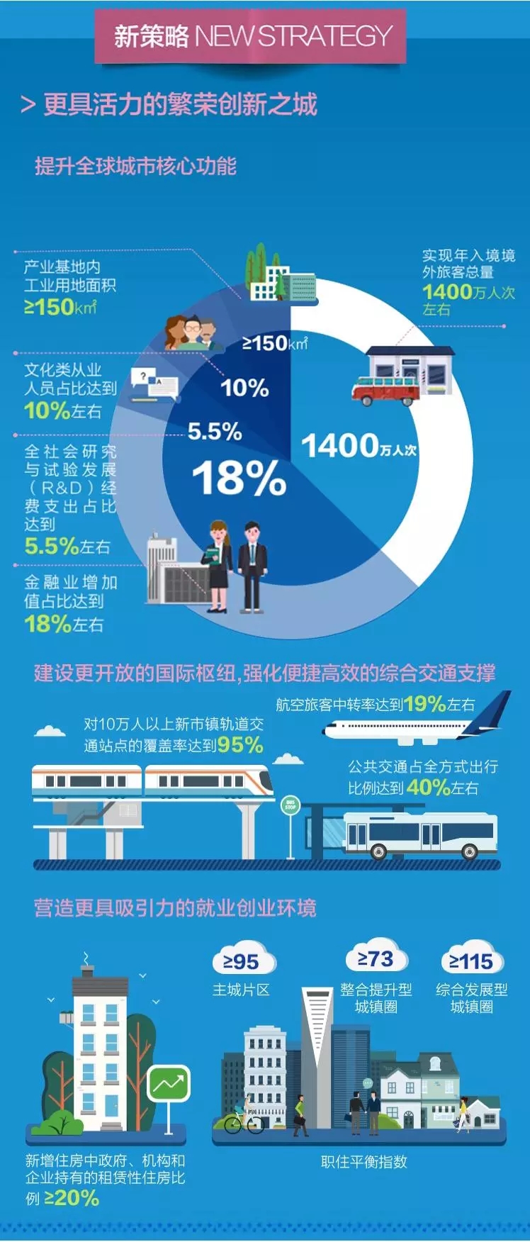 未來的上海,將進一步提升全球城市核心功能。以上海張江綜合性國家科學中心為核心,發(fā)展多樣化的創(chuàng)新空間,營造激發(fā)創(chuàng)新活力的制度環(huán)境,向具有全球影響力的科技創(chuàng)新中心進軍。通過提高國際金融功能影響力和國際貿(mào)易服務輻射能級,提升對全球經(jīng)濟輻射能力。塑造國際文化大都市品牌和城市整體形象,打造國際時尚設計之都和世界著名旅游目的地城市,擴大國際文化影響力。著力保障先進制造業(yè)發(fā)展,鎖定一批承載國家戰(zhàn)略功能,代表國內(nèi)制造業(yè)最高水平的產(chǎn)業(yè)基地,產(chǎn)業(yè)基地內(nèi)工業(yè)用地面積不少于150平方公里。