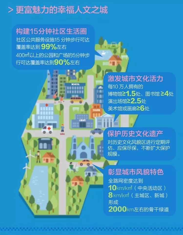 打造15分鐘生活圈,營造幸福宜居社區(qū)。包括:打造宜居、宜業(yè)、宜學、宜游的社區(qū),優(yōu)化社區(qū)生活、就業(yè)和出行環(huán)境,建設TOD社區(qū),為城市居民提供一個全時段運營的城市。提供覆蓋全年齡段的公共服務保障,社區(qū)公共服務設施15分鐘步行可達覆蓋率將達到99%左右。加快建立多主體供給、多渠道保障、租購并舉的住房制度。多渠道增加租賃性住房比重,至2035年,政府及機構(gòu)持有的租賃性住房比重約8-10%。提供人才公寓、國際化社區(qū)、適老性住宅等滿足市民多層次、多樣化的住房需求。