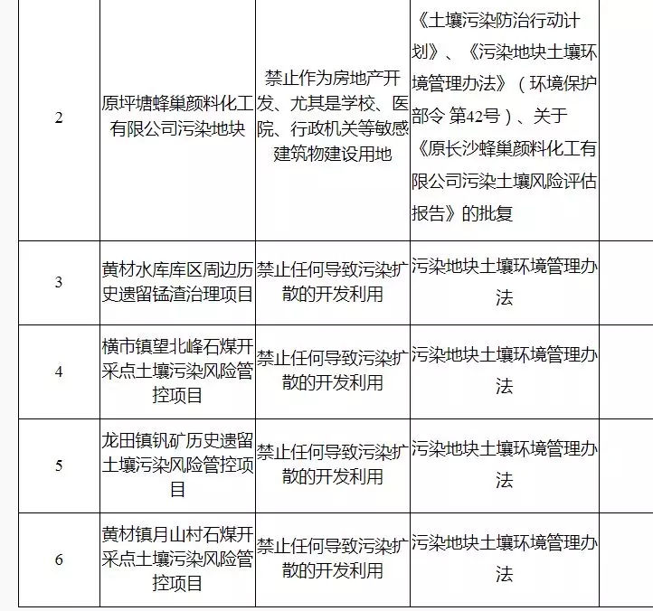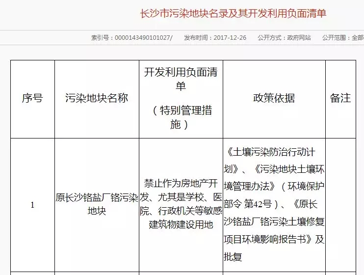 2017年12月26日 長(zhǎng)沙市環(huán)境保護(hù)局公布了《長(zhǎng)沙市污染地塊名錄及其開發(fā)利用負(fù)面清單》,共有6塊污染地塊。
