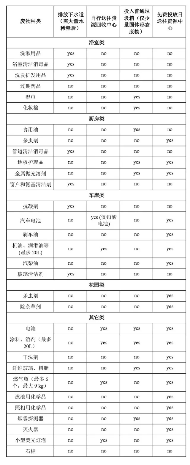 家庭危險(xiǎn)廢物包括漂白劑、花園和泳池用化學(xué)品、油漆、溶劑等。居民可打電話給市政部門上門收集,或包裝好送往資源處理中心,但處理都會(huì)收費(fèi)。每年每個(gè)區(qū)域(類似我們的街道)都會(huì)有兩三次免費(fèi)日,在這幾天送危險(xiǎn)廢物將不收費(fèi)。由于危險(xiǎn)廢物種類繁多,為了便于居民區(qū)分這類廢物與其它廢物,市議會(huì)有詳細(xì)的垃圾投放指導(dǎo),如表2所示。