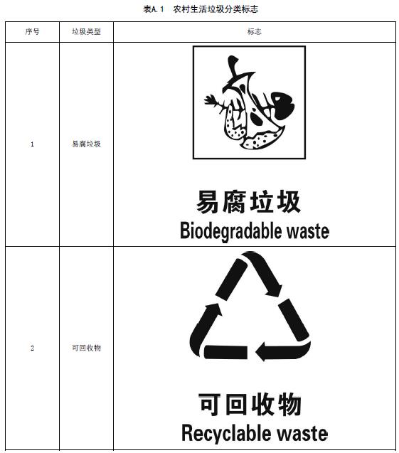 農(nóng)村生活垃圾分類標(biāo)志見表A.1,彩色標(biāo)志的顏色可按照GB/T19095的要求。