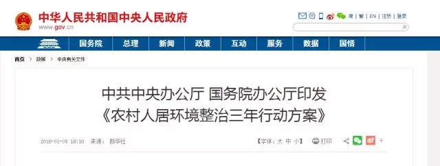 5號(hào),中共中央辦公廳 國(guó)務(wù)院辦公廳印發(fā)《農(nóng)村人居環(huán)境整治三年行動(dòng)方案》?!斗桨浮访鞔_,以建設(shè)美麗宜居村莊為導(dǎo)向,以農(nóng)村垃圾、污水治理和村容村貌提升為主攻方向,到2020年,實(shí)現(xiàn)農(nóng)村人居環(huán)境明顯改善,村莊環(huán)境基本干凈整潔有序,村民環(huán)境與健康意識(shí)普遍增強(qiáng)。