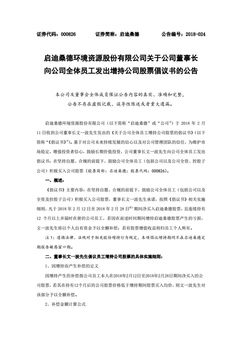 “若因在前述時(shí)間期間增持啟迪桑德股票產(chǎn)生的虧損,文一波先生將以個(gè)人自有資金予以全額補(bǔ)償;若有股票增值收益則歸員工個(gè)人所有。”