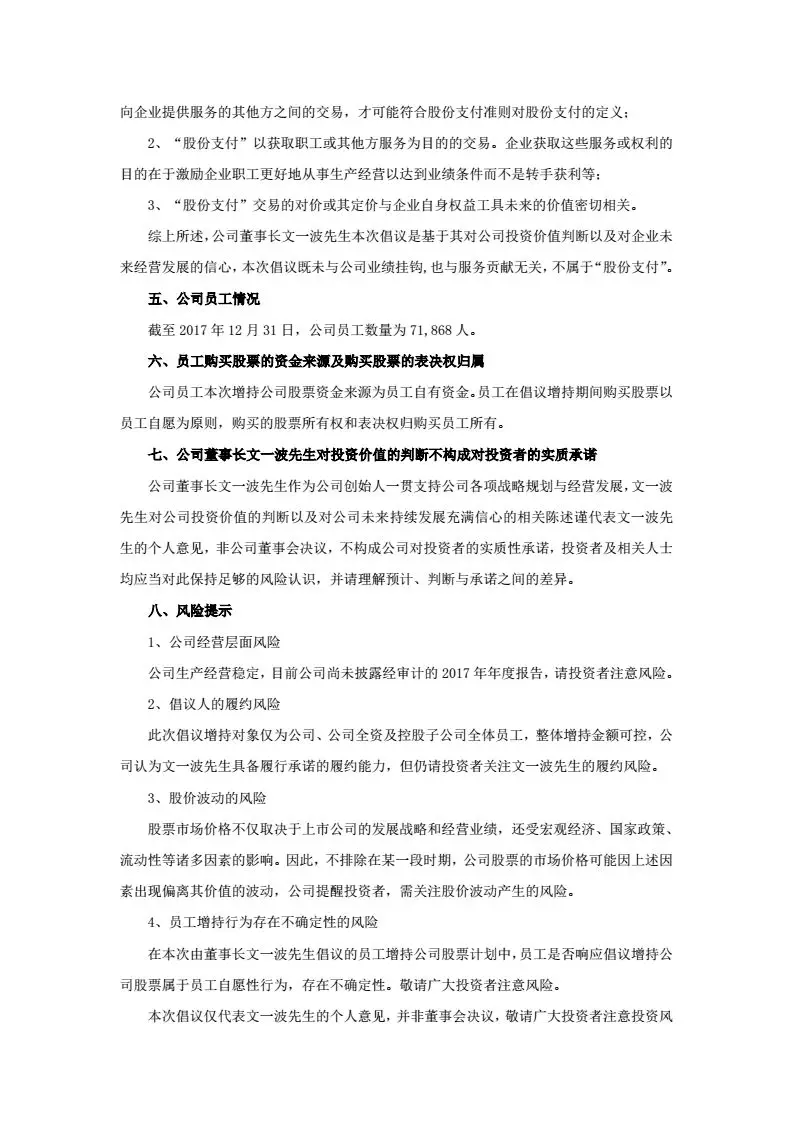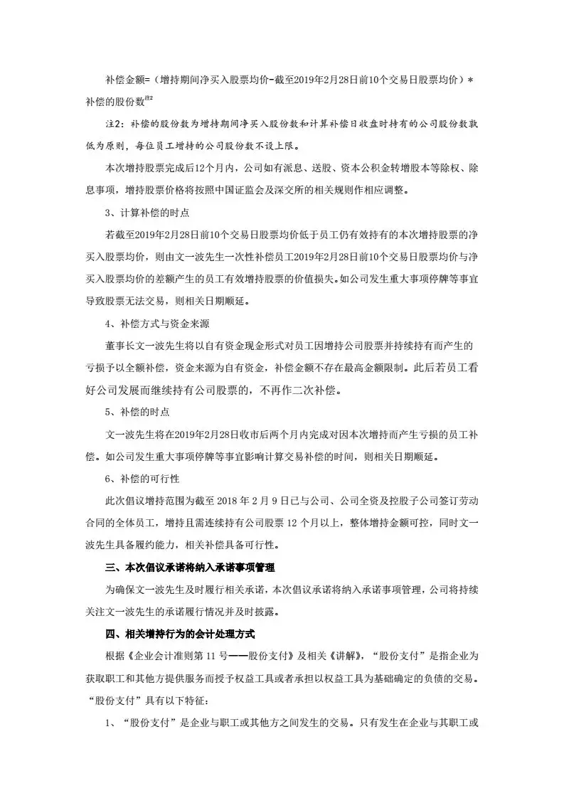 二、補(bǔ)償不設(shè)上限?!岸麻L(zhǎng)文一波先生將以自有資金現(xiàn)金形式對(duì)員工因增持公司股票并持續(xù)持有而產(chǎn)生的虧損予以全額補(bǔ)償,資金來(lái)源為自有資金,補(bǔ)償金額不存在最高金額限制?!睋Q句話(huà)說(shuō)就是,虧多少,補(bǔ)多少,你虧,董事長(zhǎng)補(bǔ)!