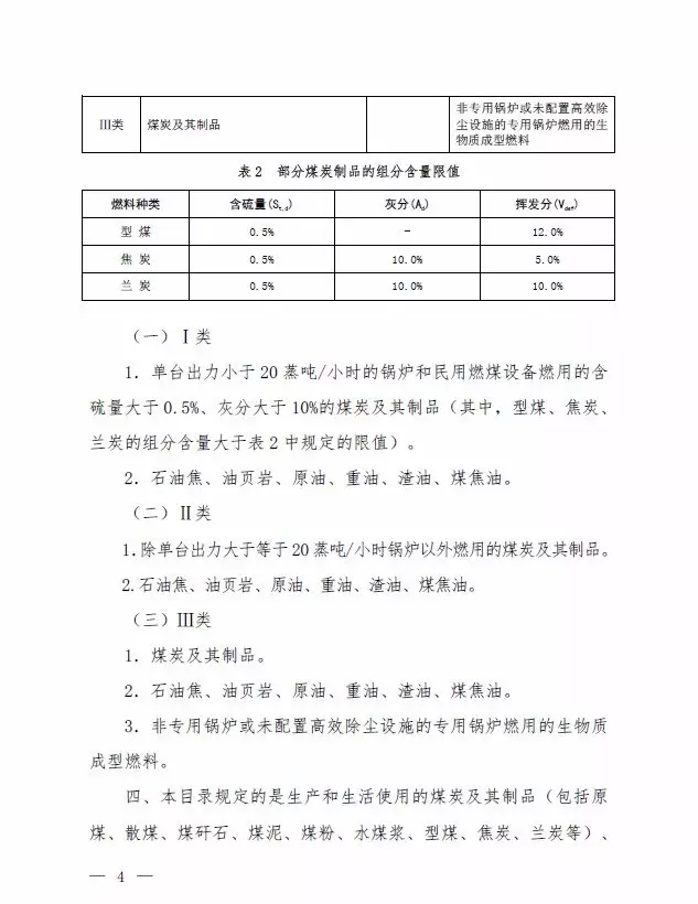 第Ⅰ類(lèi),考慮到中西部地區(qū)部分城市煤炭使用還存在規(guī)?;讲桓叩默F(xiàn)象,從鼓勵(lì)煤炭清潔利用角度,提出單臺(tái)出力小于20蒸噸/小時(shí)的鍋爐和民用燃煤設(shè)備燃用的含硫量大于0.5%、灰分大于10%的煤炭納入禁燃范圍。其中,型煤、焦炭、蘭炭的揮發(fā)分含量不能大于12%、5%和10%,對(duì)型煤的灰分含量沒(méi)有要求。