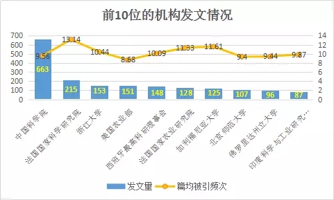 圖3 全球土壤污染防治發(fā)文量位居前10位的機構(gòu)發(fā)文情況(2012-2016年)