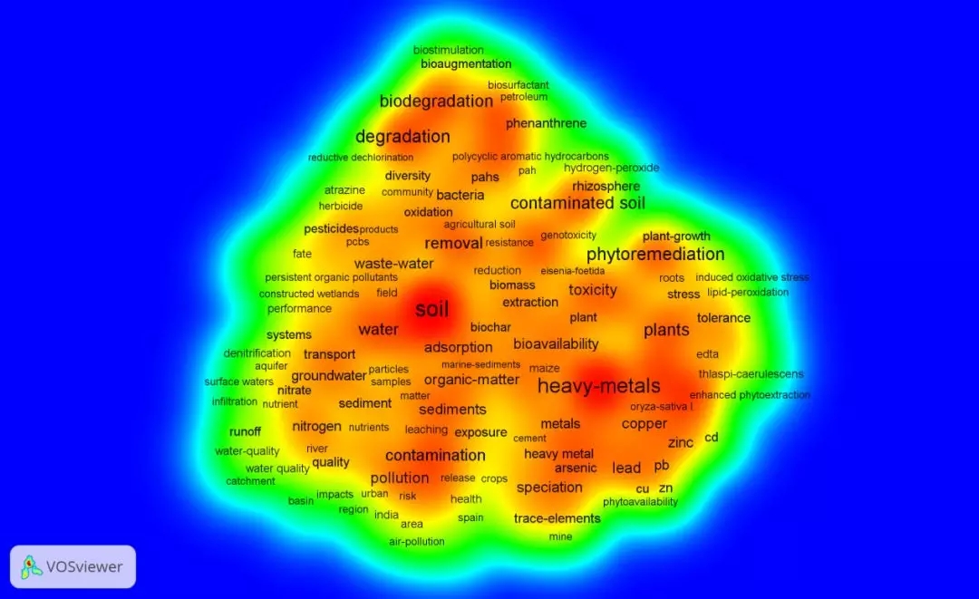 關(guān)鍵詞共現(xiàn)知識圖譜和熱點圖分別見圖4和圖5,可以發(fā)現(xiàn)該領(lǐng)域研究熱點集中于面源污染(water,nonpoint-source pollution)、重金屬防治(heavy-metals)、生物修復(fù)(biodegradation,bioremediation)、植物修復(fù)(plants,phytoremediation)、微生物修復(fù)(bacterial community)等方面,對比化學(xué)修復(fù)和物理修復(fù),近幾年科學(xué)家們更關(guān)注綠色環(huán)保的生物修復(fù)技術(shù),并出現(xiàn)了一些修復(fù)技術(shù)手段的交叉融合使用。在地域方面,發(fā)展中國家如中國和印度國家的土壤污染狀況受到更高的關(guān)注。