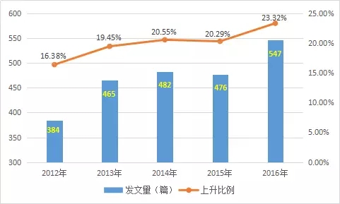 據(jù)統(tǒng)計,中國知網(wǎng)收錄的近5年土壤污染防治核心期刊文獻共2345篇,年度發(fā)文量總體呈上升趨勢(見圖6),上升率由2012年的16.38%升至2016年的23.32%,高出了6.94%,從年度論文數(shù)量的變化中可以看出我國學(xué)術(shù)界對土壤污染防治的關(guān)注度上升,說明我國科研人員越來越重視土壤污染防治的研究。