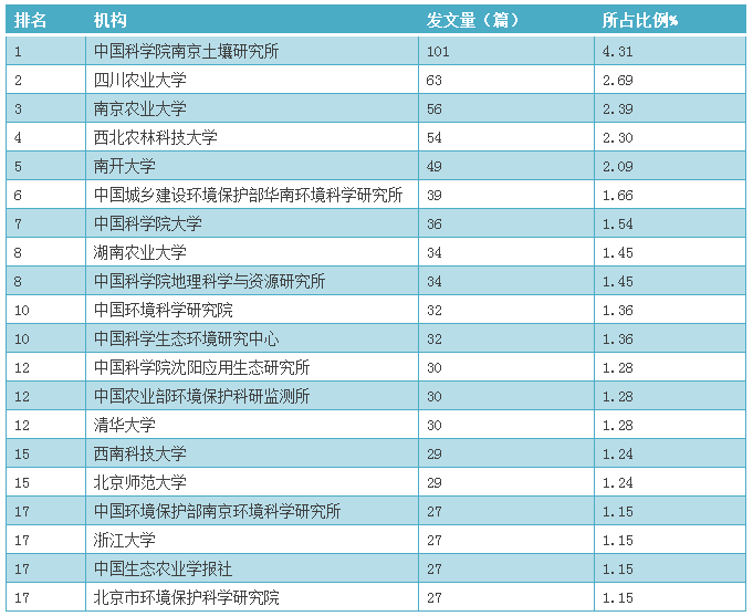 截至2016年發(fā)表的土壤污染防治相關(guān)研究論文中,發(fā)文量位居前20位的科研機構(gòu)或單位見表5。中國科學(xué)院南京土壤研究所發(fā)文量101篇,以絕對性優(yōu)勢居榜首,四川農(nóng)業(yè)大學(xué)以63篇發(fā)文居第二,南京農(nóng)業(yè)大學(xué)以7篇之差位列第三。前20位的機構(gòu)中,共有10所高校入圍,其中4所是農(nóng)業(yè)類院校;科研機構(gòu)有9個入圍??梢?,高校和科研機構(gòu)是我國研究土壤污染防治的主力軍。