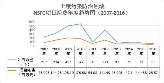 通過統(tǒng)計2007-2016十年內(nèi)我國國家自然科學(xué)基金的項目數(shù)據(jù),可知土壤污染防治領(lǐng)域的項目經(jīng)費在2007-2010年呈穩(wěn)步上升趨勢,2010年申請通過的項目達峰值547個,2011年有所回落,2012年又激增到390個,之后幾年呈現(xiàn)了下降趨勢,2016年僅通過55個項目,經(jīng)費也隨之下降,如圖9所示。