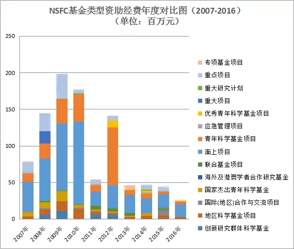 圖11 國家自然科學(xué)基金基金類型資助經(jīng)費年度對比圖(2007-2016年)